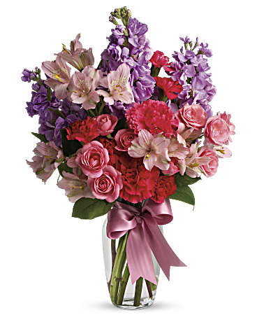 Your special someone is sure to fall in love with this elegant bouquet featuring soft lavender and pink flowers. A pink ribbon adds an extra touch of feminine flair to this traditional arrangement.
