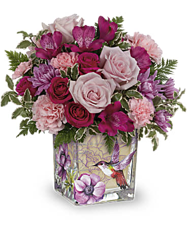 Like a hummingbird flitting around a secret garden, this delightful bouquet of pink roses in a vintage-inspired glass cube is a magical gift on Mother’s Day or any special occasion.
